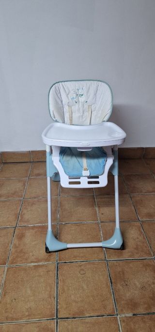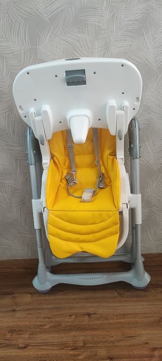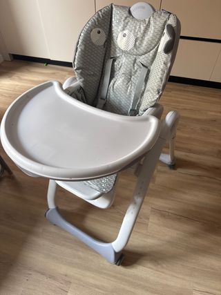 Trona de bebé de la marca Chicco, ideal para las comidas. - Asiento acolchado y reclinable. - Bandeja extraíble. - Altura regulable. con algunos signos de desgaste como se puede ver en las fotos
