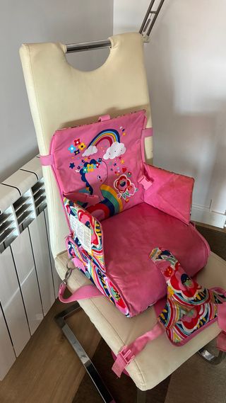 Trona de viaje Tuctuc rosa. En muy buen estado, excepto la cremallera del compartimento interior que está deteriorada pero aún funciona.