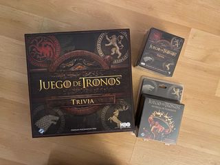 Pack ideal para fans de la serie Incluye: Trivia – Juego de Tronos (juego base) Abierto pero sin usar, en perfecto estado. Expansión Temporadas 5–8 NUEVO, sin abrir. Juego de cartas “Intriga en Poniente” NUEVO, sin abrir. Valorado en casi 60€ Precio del pack: 30€ Precio ya muy ajustado, no negociable. Se vende todo junto. No por separado. Solo gente realmente interesada, gracias.