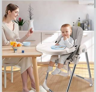 Trona de la marca Asalvo en color gris. Perfecta para las comidas de los más pequeños. - Asiento acolchado. - Arnés de seguridad. - Bandeja extraíble.
