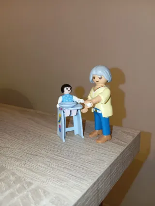 Set de Playmobil que representa a una abuela alimentando a un bebé. - Figura de abuela con blusa amarilla y pantalón azul. - Figura de bebé en trona azul con plato. - Accesorios de alimentación. Más Playmobil en mi perfil Envío rápido y cuidadoso