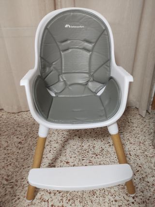 Preciosa trona de bebé de la marca Bébé Confort, ideal para que los más pequeños coman con comodidad y seguridad. Se encuentra en muy buen estado. - Trona evolutiva, adaptable a diferentes edades. - Estructura de madera de haya. - Asiento acolchado gris. - Bandeja extraíble blanca. - Incluye correas de seguridad