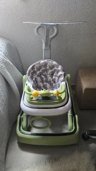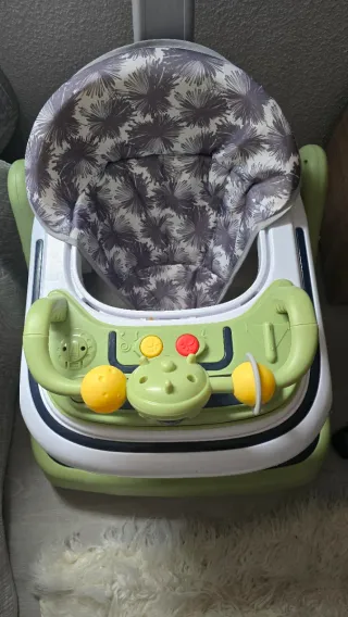 Andador plegable para bebés, ideal para ayudarles en sus primeros pasos. Su diseño es práctico y seguro. - Asiento acolchado con estampado. - Bandeja de juegos con elementos interactivos. - Estructura de plástico resistente.