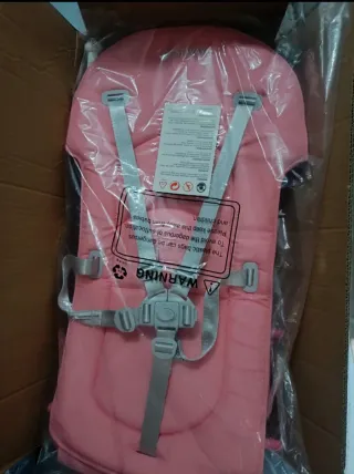Trona y hamaquita de bebé. Tiene ambas funciones. Es regulable en altura y reclinable en 3 posiciones. Lleva ruedas y un cojín reductor (se puede ver en las fotos) para poder usarla desde los primeros días. Lleva correas de seguridad y la parte de los pies también se puede regular. La funda se puede quitar fácilmente para poder lavarla.
