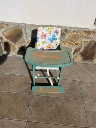 Trona o sillita infantil con un diseño alegre y colorido. - Estructura de madera pintada en color verde azulado. - Cojines con estampado de mariposas y rayas. - Reposapiés de madera. - Requiere como se muestra de hacer algún cambio.