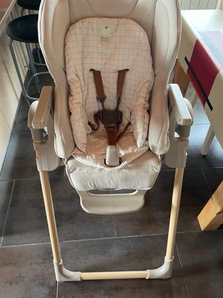 Trona para bebé en muy buen estado, con un diseño acolchado en color beige. - Asiento acolchado. - Bandeja extraíble. - Arnés de seguridad.