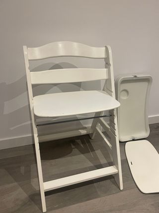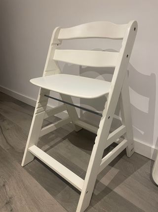 Trona infantil evolutiva de la marca Hauck en color blanco. Se adapta al crecimiento del niño. Precio original 120€ No negociable - Bandeja extraíble. - Arnés de seguridad. - Reposapiés ajustable.