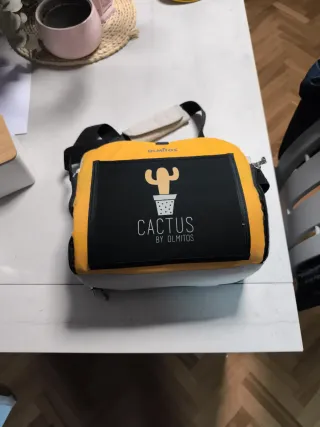 Trona de viaje de la marca Olmitos con un divertido diseño de cactus. -Se adapta perfectamente a cualquier silla - Color amarillo y negro. - Asa para colgar. - Cierre de cremallera.