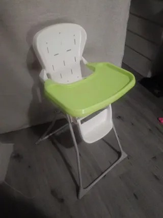 Silla de comer para bebé con un divertido estampado de frutas y verduras. Es plegable para facilitar su almacenamiento. Está como nueva apenas la ha utilizado - Estructura metálica. - Asiento acolchado con estampado. - Bandeja de plástico blanca. - Arnés de seguridad.
