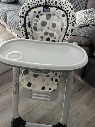 Trona Chicco Polly Progress con un divertido estampado. - Diseño con manchas en blanco, negro y gris. - Bandeja extraíble. - Altura ajustable en 8 posiciones. - Respaldo reclinable.