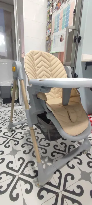 Trona de bebé de la marca Jane, ideal para las comidas. - Asiento acolchado. - Bandeja extraíble. - Estructura resistente. También sirve como silla para el bebé, tiene una colcha que hace que el tamaño reduzca para poder poner a los bebés que aún no comen, y se puede bajar hasta dejarlo a la altura del suelo, también puede echarse para atrás para que eche siesta.
