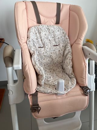Trona evolutiva Mila de la marca Jané. Su diseño es moderno y funcional. - Color rosa y beige. - Asiento acolchado. - Bandeja extraíble.