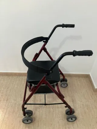 Andador diseñado para personas con movilidad reducida. Cuenta con un asiento y una cesta. - Estructura metálica. - Asiento acolchado. - Cesta de almacenamiento. - Ruedas para facilitar el desplazamiento. Se ha usado tan sólo durate tres meses. Super bien conservado y cuidado. Para frenar el andador se hace haciendo presión hacia abajo, es más sencillo que otros modelos que tienen freno con manecilla, porque hay personas que tienen dificultad de movimiento en las manos. Fácil de plegar para guadar en el coche.