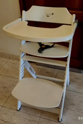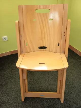 Trona de madera Child Wood, en buen estado y muy robusta. - Fabricada en madera. - Diseño seguro y estable. - Alturas regulables - Con bandeja