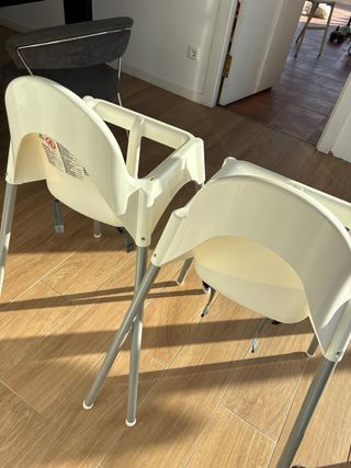 Dos sillas para bebé de Ikea, de plástico blanco. Son ligeras y fáciles de limpiar. - Ideales para que los más pequeños coman con comodidad. - Fabricadas en plástico resistente. - De color blanco.
