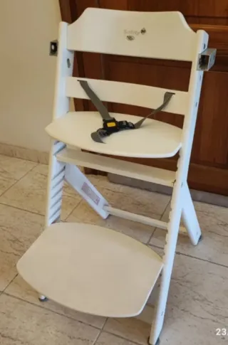 Trona de madera blanca para bebé, con cinturón de seguridad. - Diseño clásico y funcional. - Material de madera. - Color blanco.