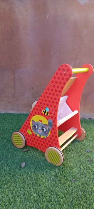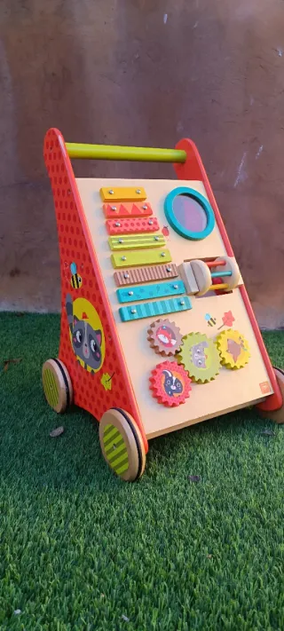 Andador de madera para bebés - Incluye xilófono, engranajes y laberinto de cuentas - Hay un espacio detras para transportar cositas por la casa. :) Lo hemos comprado nuevo en abril 2025 de eureka kids, precio original 65€.