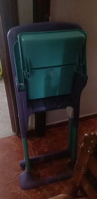 Trona de plástico en dos tonos, morado y turquesa. Ideal para los más pequeños. - Asiento y respaldo de plástico. - Bandeja de plástico. - Base de plástico. Puedes plegarse fácilmente para que ocupe menos espacio en la casa