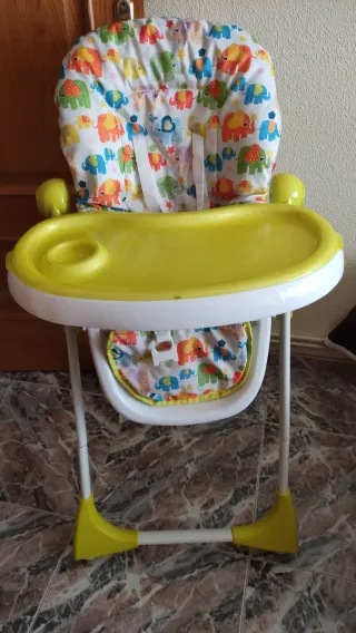 Trona de bebé en excelente estado, casi nueva. Su diseño alegre con estampado de elefantes la hace muy llamativa. - Cojín acolchado con divertido estampado. - Arnés de seguridad de 5 puntos. - Reposapiés integrado.
