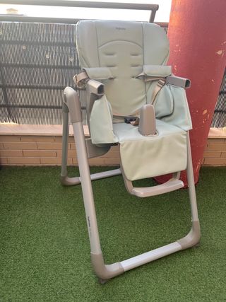 Trona de bebé Peg Perego en color turquesa y blanco. Perfecta para las comidas de los más pequeños. Estructura perfecta - Asiento acolchado. Rota la funda de lavar en lavadora. Necesita cambio - Arnés de seguridad. - Bandeja extraíble. - Ruedas para facilitar el movimiento.