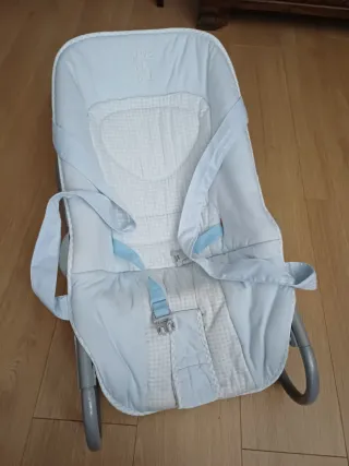 Hamaca para bebé de la marca Prenatal. Es cómoda y segura para los más pequeños. - Color azul claro y blanco. - Tejido acolchado. - Arnés de seguridad.