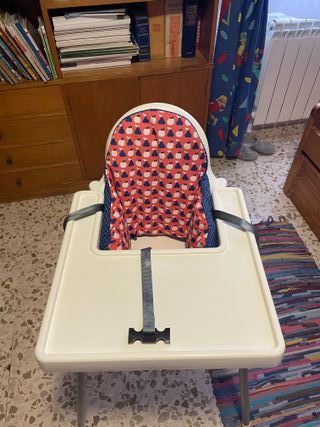 Trona de Ikea en muy buen estado, incluye cojín. - Cojín con estampado de manzanas rojas y azules. - Estructura blanca.