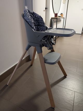 Trona infantil con un diseño moderno y funcional. Usada. - Estructura principal en color azul. - Asiento acolchado en gris. - Patas estables para mayor seguridad.