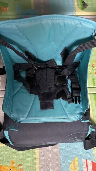 Preciosa trona portátil para bebé, ideal para llevar a cualquier parte. Se encuentra en buen estado, aunque presenta algunas pequeñas manchas de uso. - Trona plegable y fácil de transportar. - Diseño ligero y compacto. - Incluye correas para sujetar a la silla.