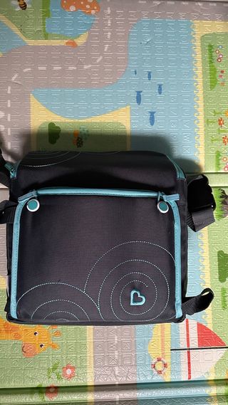 Trona portátil de color azul y gris, ideal para llevar a cualquier parte. Cuenta con un arnés de seguridad de 5 puntos para mayor protección. Es tipo bolso y lleva un bolsillo. - Arnés de 5 puntos. - Tejido acolchado. - Diseño plegable.