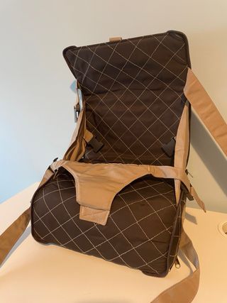Práctica trona de viaje. - Asiento acolchado. - Cinturón de seguridad. - Correas para sujetar a la silla, se adapta prácticamente a cualquier asiento - Uno de los bolsillos laterales tiene aislante térmico. - Toda la zona del asiento es un bolsillo de almacenaje de gran capacidad.