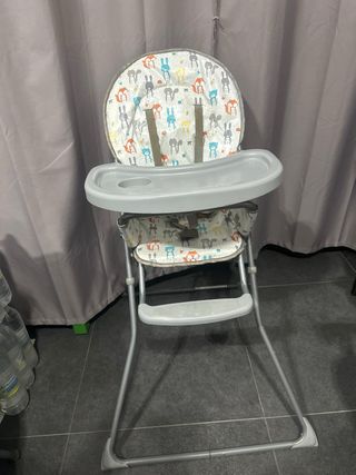 Trona de bebé con un divertido estampado de animales del bosque. - Cojín acolchado para el asiento y respaldo que es impermeable - Bandeja extraíble con signos de uso tal y cómo se ve en la foto - Arnés de seguridad muy usado , lo ideal seria comprar unos nuevos - Reposapiés. - Estructura plegable para fácil almacenamiento.