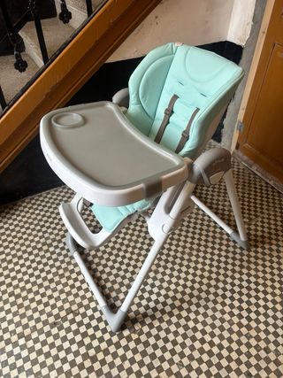 Trona de viaje Chicco Chairy, ideal para llevar a cualquier parte. Se pliega fácilmente y ocupa poco espacio. - Ligera y fácil de transportar. - Incluye bandeja extraíble. - Arnés de seguridad para el peque. - Estructura de aluminio resistente. - Tapizado lavable. Usada en casa de abuelos para ocasiones que el niño se quedaba a comer. 2 años de uso, está como nueva.