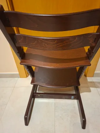 Trona infantil de madera en color marrón oscuro. Su diseño evolutivo se adapta al crecimiento del niño. - Material: Madera. - Color: Marrón oscuro. - Diseño evolutivo.