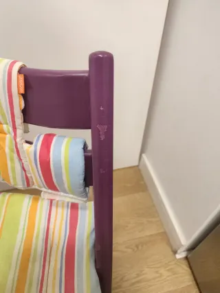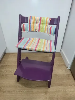 Trona Stokke en color lila, ideal para que los más pequeños coman cómodamente. - Diseño ergonómico. - Cojines a rayas de colores.