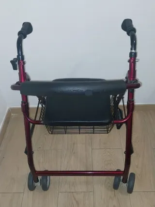 Andador ligero y práctico, ideal para facilitar la movilidad. - Estructura de aluminio en color burdeos. - Asiento acolchado negro. - Cesta de alambre. - Ruedas delanteras.