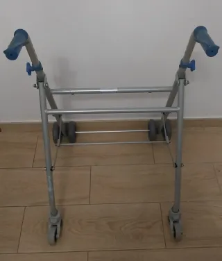 Andador de segunda mano con estructura aluminio y asas de color azul. - Dos ruedas delanteras. - Dos ruedas traseras. - Altura ajustable.