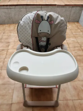 Trona evolutiva de la marca Hauck, con un diseño divertido de jirafa. - Cojín acolchado con estampado de topitos. - Arnés de seguridad. - Bandeja extraíble. - incluye hamaca o silla. - regulable en altura Algún signo de desgaste