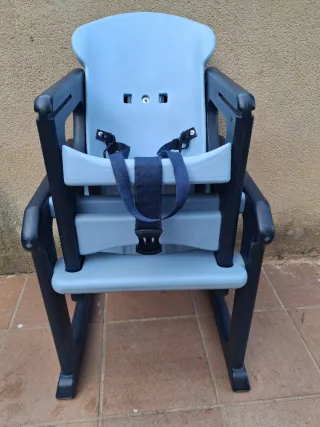 Trona plegable en perfectas condiciones con arnés para la sujeción del bebé y arnés para sujeción a la silla, dispone de asa para su transporte y almacenaje en la parte inferior.