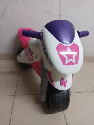 Moto correpasillos de plástico en colores rosa, blanco y morado. Ideal para los más pequeños. - Diseño deportivo con detalles de estrellas y RR. - Ruedas negras. - Manillar morado.