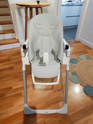 Trona marca Peg Perego modelo Follow me. 4 ruedas por lo que es facil desplazarla. Funda desenfundable y de polipiel para un fácil lavado. Doble bandeja extraíble. Se baja en altura y se acuesta el respaldo, por lo que sirve de hamaca en los primeros meses. En muy buen estado. No lleva correas para atar al bebé. las tiré porque resultan innecesarias. A un bebé no hay que atarlo mientras come porque si se atraganta hay que poder actuar rápido. Pero se pueden comprar o adaptar otras correas.