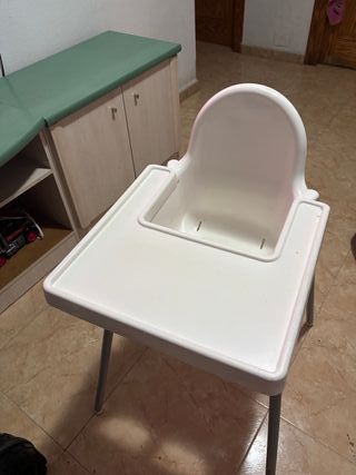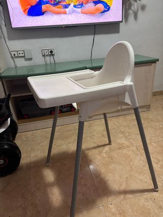 Trona alta de IKEA, modelo Antilop, en color blanco. Diseñada para facilitar la hora de comer de los más pequeños. - Bandeja de plástico. - Cinturón de seguridad. - Patas de metal.