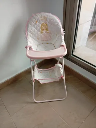 Trona de juguete con un bonito diseño para muñecas. - Estructura de metal rosa. - Cojín acolchado con estampado de princesa. - Bandeja de plástico rosa. - Cesta de tela inferior.