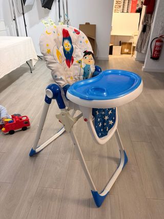 Trona para bebé con un divertido diseño espacial, ideal para los más pequeños. - Asiento acolchado con estampado de cohetes y astronautas. - Bandeja azul extraíble. - Estructura plegable para un fácil almacenamiento.