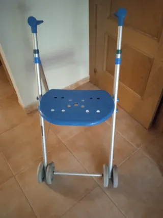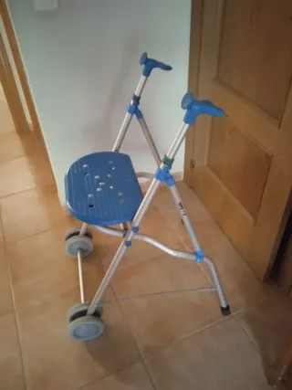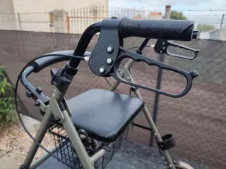 Andador tipo silla para personas mayores, diseñado para facilitar la movilidad. - Estructura metálica. - Asiento acolchado. - Cesta de almacenamiento. - Ruedas para desplazamiento con freno mediante gatillo en puños. -Portabotellines. -Muy poco uso y en muy buen estado.