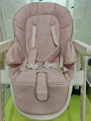 Trona para bebé en color rosa, prácticamente nueva. Solo ha tenido dos meses de uso. - Asiento acolchado. - Bandeja extraíble. - Patas ajustables en altura.