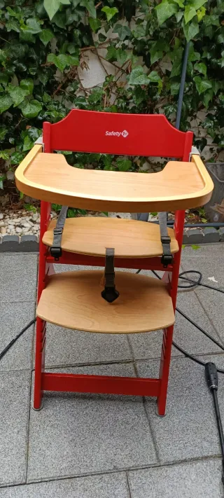 Trona de bebé Safety 1st, ideal para las comidas de los más pequeños. Su diseño es práctico y seguro. - Estructura principal de color rojo. - Bandeja y asientos de madera. - Arnés de seguridad de tres puntos.