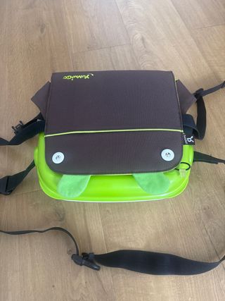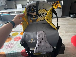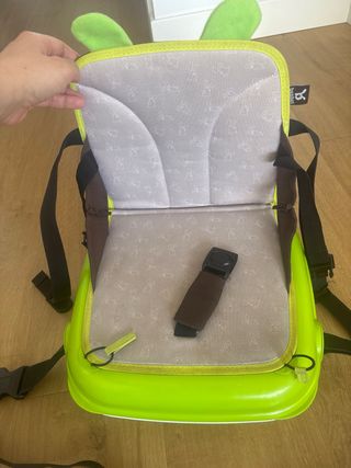 Práctico trona o alzador portátil de la marca Yumigo, ideal para llevar a cualquier parte. Su diseño es divertido y funcional. Tiene marcas de uso y la tela algo manchada, pero esta en muy buen estado.