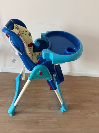 Trona plegable para bebé con un diseño de rayas azules y detalles en rojo. Es práctica y fácil de guardar. En muy buen estado. Dimensiones 89,5 (ancho) x 25 (fondo) x 104 (alto) cm Dimensiones producto cerrado 56,5 (ancho) x 35 (fondo) x 105 (alto) cm - Asiento acolchado con estampado de rayas. - Bandeja extraíble. - Arnés de seguridad. - Estructura plegable para un fácil almacenamiento.