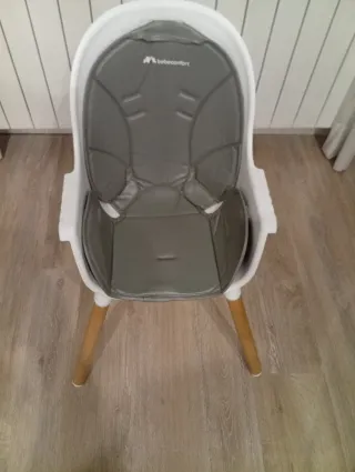 Trona de bebé con un diseño moderno y funcional. Perfecta para las comidas del pequeño. - Cojín acolchado gris. - Estructura de madera. - Marca: Bebeconfort.