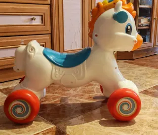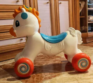 Correpasillos infantil Tito el caballito para bebés. Un divertido compañero para los primeros pasos. - Diseño de caballito blanco con detalles en azul y naranja. - Ruedas de color rojo con diseño de espiral. -Con opción de ponerlo en modo balancín.